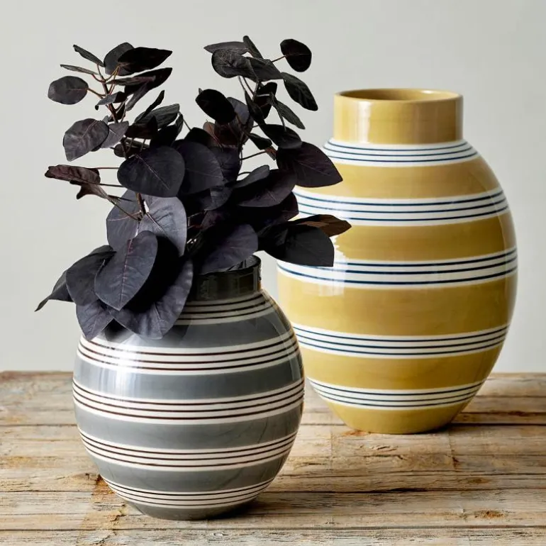 Med tilføyelsen av to nye vaser i Omaggio Nuovo-serien er det helt nye muligheter for å kombinere kjærligheten for keramikk med kjærligheten for blomster. De nye vasene kommer i en kremhvit bunnfarge og med striper i to forskjellige grunnfarger: oker og grå. Begge er dekorert med striper ? både smale og brede ? så vasene får «stripene i stripen» som kjennetegner Omaggio Nuovo. I tråd med Kählers stolte håndverkstradisjoner er alle stripene håndmalte. Dette gir dem et unikt uttrykk med dybde og liv som gjør dem til små kunstverk ? malt for hånd og helt unike.