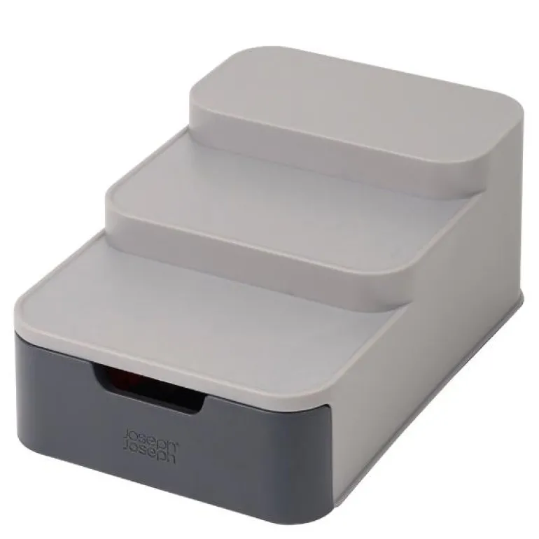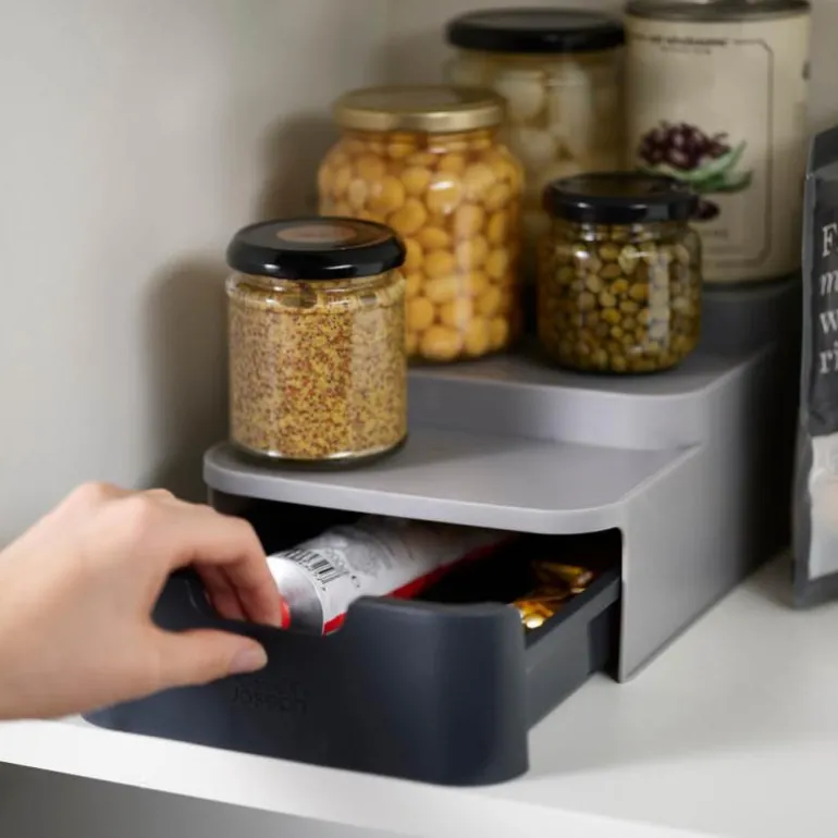 Gjør organiseringen av kjøkkenskapet enklere med Joseph Josephs innovative design – CupboardStore. Denne trappformede boksen gjør det enklere å få øye på varene bakerst i skapet, samtidig som den har en plassbesparende skuff i bunnen. Perfekt for både hermetikk og krydder, denne boksen måler 26 cm i lengde, 17 cm i bredde og 11 cm i høyde, og er laget av PP plast.