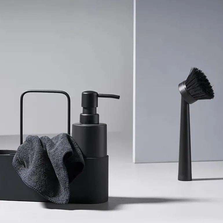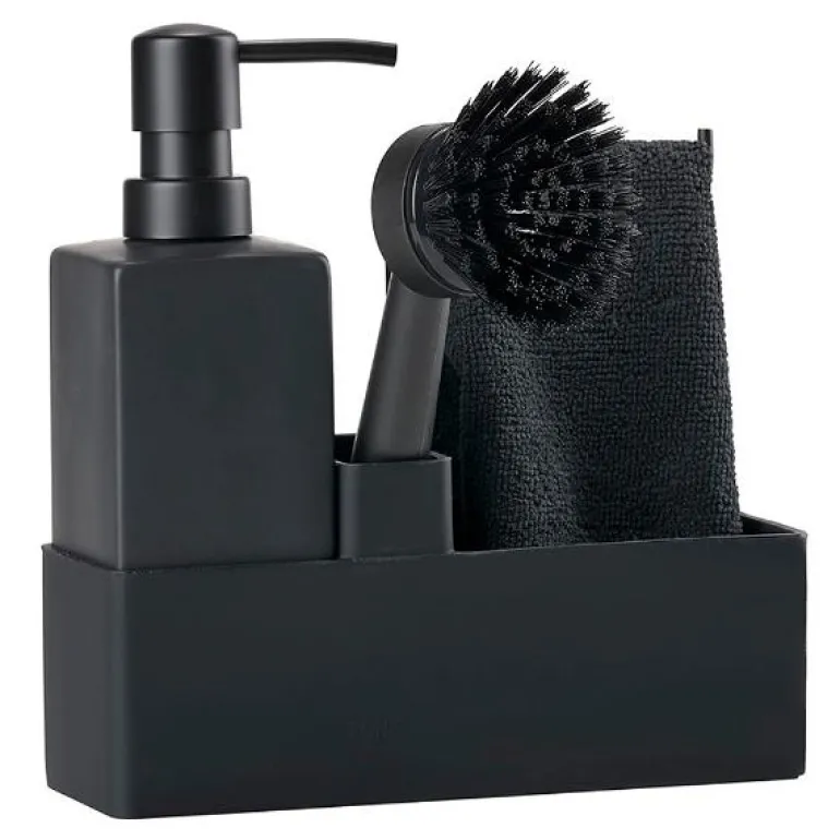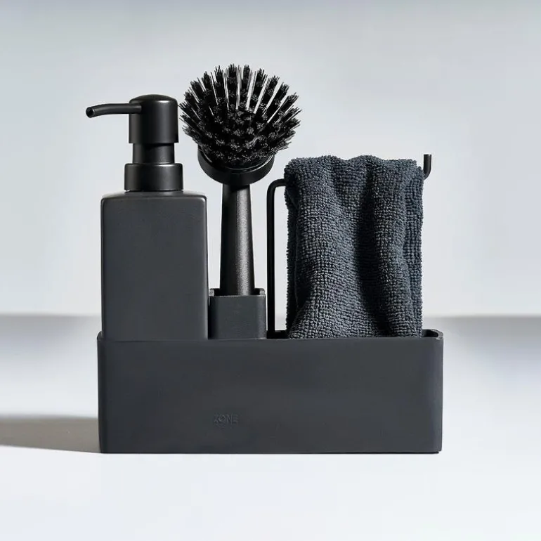Zones populære alt-i-ett-oppvasksett med oppvaskklut. Såpedispenseren er laget i solid keramikk, og oppbevaringsdelen er av ripefri og rengjøringsvennlig silikon. Børsten kan stå på egen hånd, og børstehodet kan byttes ut, slik at du alltid har en ren børste. Alt-i-ett-oppvasksettet har gjort rent bord over hele Europa i mer enn ti år. Den medfølgende mikrofiberkluten inneholder naturligvis ikke mikroplast. 19 x 6 x H20,5 cm.