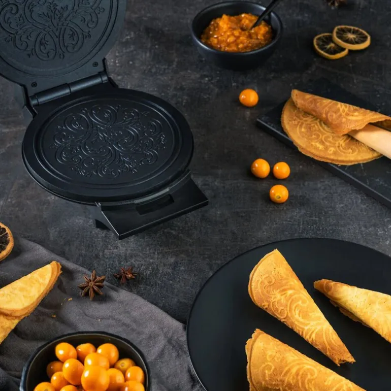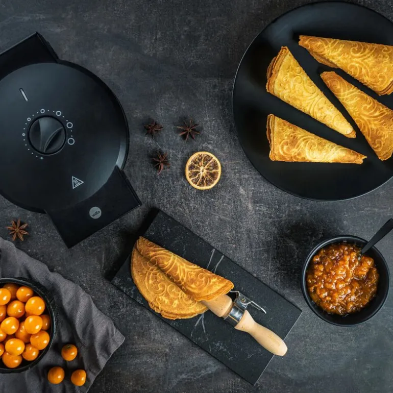 Wilfas Østerdal CC-1B krumkakejern er designet for å forene tradisjonell baking med moderne funksjonalitet. Med det klassiske østerdalsmønsteret preger dette jernet krumkakene dine med et tidløst design, mens de solide aluminiumplatene med dobbelt non-stick belegg sørger for at kakene slipper lett uten behov for ekstra smøring. Den justerbare termostaten gir deg full kontroll over temperaturen, slik at du kan tilpasse stekingen til perfekte resultater hver gang. En innebygd signallampe indikerer når kakene er ferdigstekt, noe som gjør prosessen enkel og trygg.