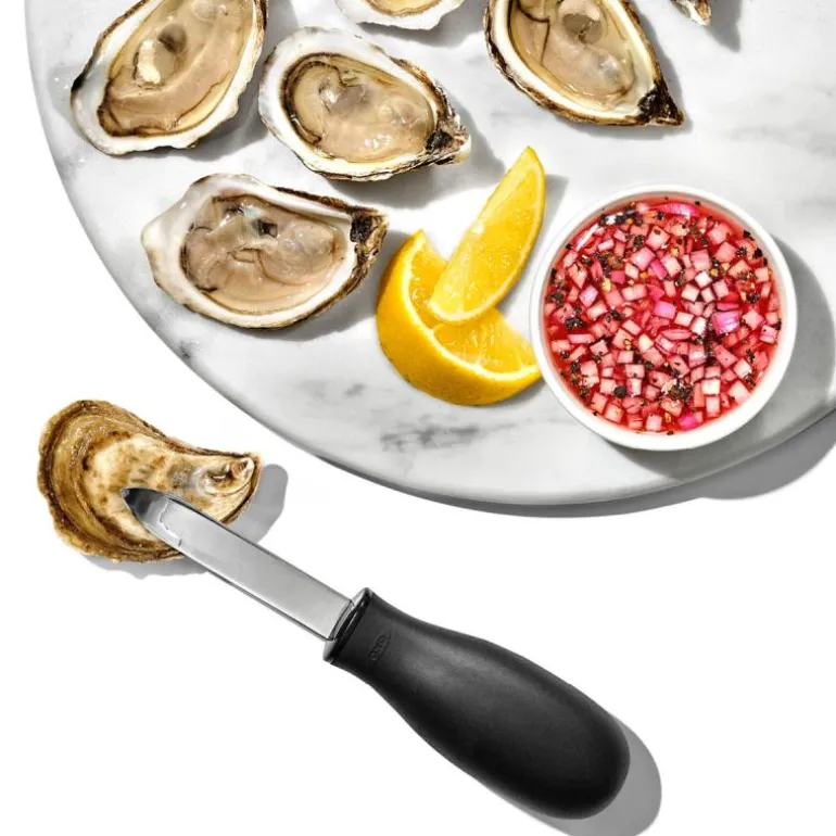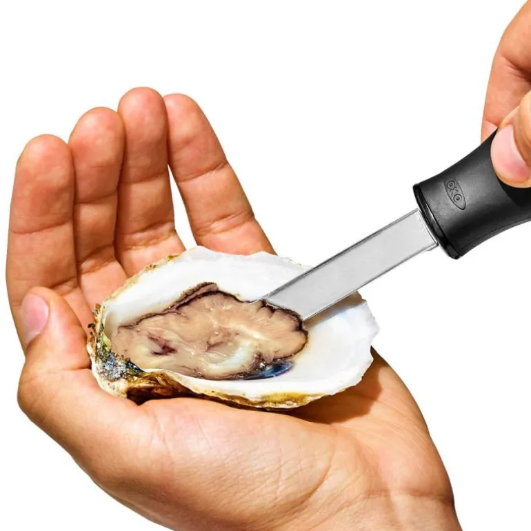 OXOs østerskniv har et robust blad med en bøyd spiss i rustfritt stål som lirker seg inn mellom selv de hardeste østersskallene for å åpne dem. Håndtakets ergonomiske design gjør at det ligger perfekt i hånden, uansett hvor mange østers du skal åpne, og non-slip grepet er behagelig å holde på, selv når hendene er våte. Tåler oppvaskmaskin.