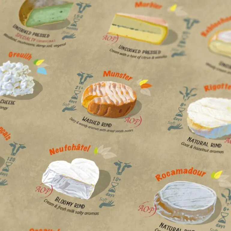 – En guide til de over 80 AOP-ostene som er med i puslespillet, inkludert nøkkeldata som ostefamilie, melketype, aromanoter, beste sesong og modningstid.