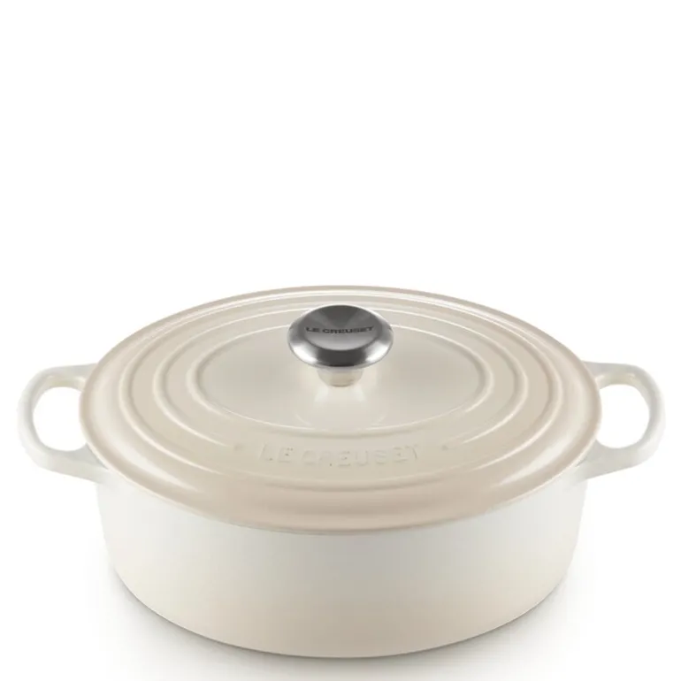 Le Creuset oval gryte, 4,1 liter, i fargen Meringue, er et klassisk og funksjonelt kjøkkenverktøy for kokker på alle nivåer. Den romslige ovale formen gjør den ideell for alt fra store kjøttstykker til familiegryteretter, mens den stilige fargen tilfører en diskret eleganse til kjøkkenet.