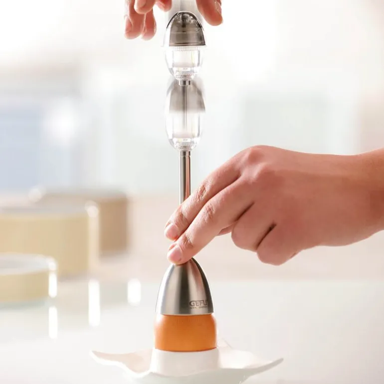 Eggeåpner med innebygd saltbøsse OVODet har aldri vært enklere å slå hull på et kokt egg. Plasser eggeåpneren over egget. Trekk håndtaket tilbake og la fjeren springe tilbake for å klekke egget. Fjern skallet hvis det er nødvendig. Den innebygde saltbøssen kan justeres med stor eller liten åpning, eller lukkes helt til oppbevaring.