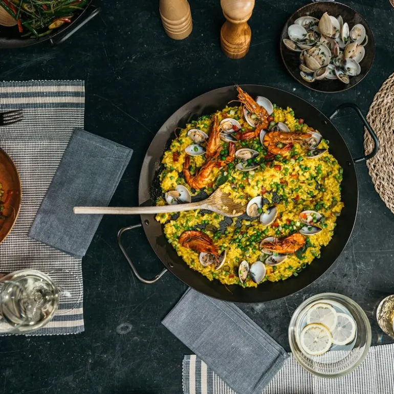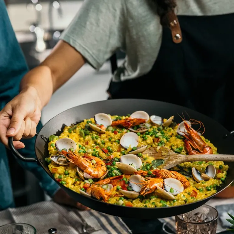 Denne 28 cm store paellapannen fra Skottsberg er laget i kullstål og passer perfekt til festmåltider og daglig bruk. Den er dobbelt innbrent med vegetabilsk olje og gir en naturlig non-stick-effekt som forbedres med hver bruk. Den 2,5 mm tykke bunnen er designet for å tåle høye temperaturer og beholde formen – selv ved bruk på induksjon.