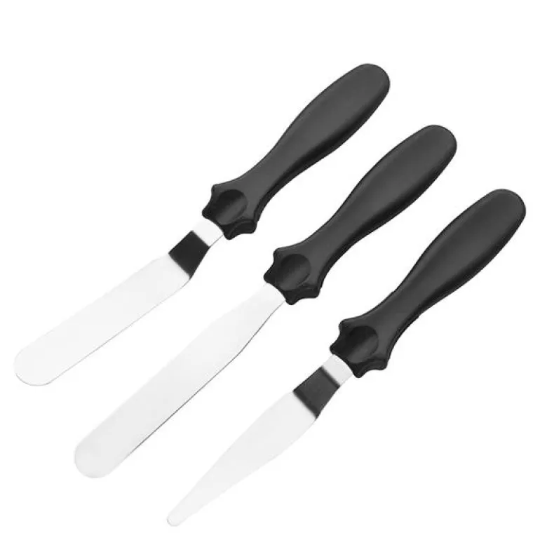 Dette praktiske palettknivsettet inneholder tre ulike kniver i rustfritt stål med ergonomiske plasthåndtak. Perfekt for å påføre glasur, smøre kremer eller håndtere delikate ingredienser med presisjon.