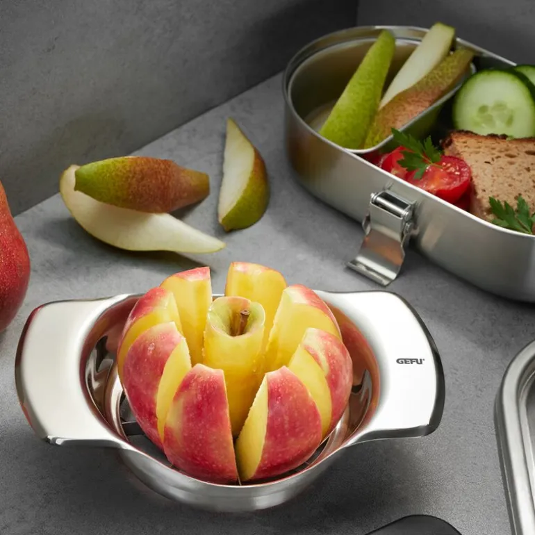 Parti epledeler fra Gefu er et praktisk verktøy for å dele epler og pærer raskt og effektivt. Med ett enkelt trykk skjærer de skarpe bladene frukten i 8 jevne segmenter og fjerner samtidig kjernen.