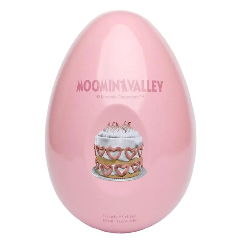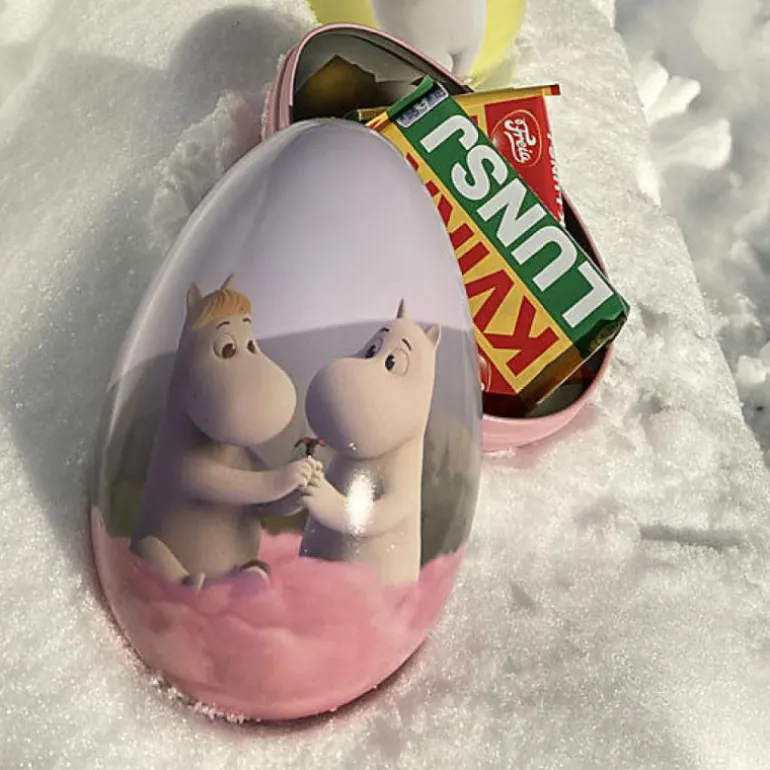 Mummi påskeegg med motiv av Mummitrollet og Snorkfrøken som svever på en rosa sky. Påskeegget er laget i tinn og kan tas frem år etter år. Det er og nydelig som dekorasjon på barnerommet. Kan åpnes og legges godteri i! Håndvask, tørkes grundig.