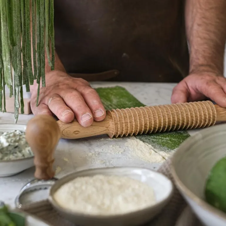 Pasta La Vista pastakutter er den ideelle følgesvennen for deg som elsker å lage hjemmelaget pasta. Med sin solide eikekonstruksjon og 32 cm lengde, er denne pastakutteren både funksjonell og vakker å se på. Den skaper perfekte fettuccine-strimler på 7 mm, slik at du kan lage deilige pastaoppskrifter hjemme med en profesjonell touch. Kjevle ut pastadeigen med en vanlig kjevle før du ruller ut fettuccine-strimlene med dette pastakjevlet.