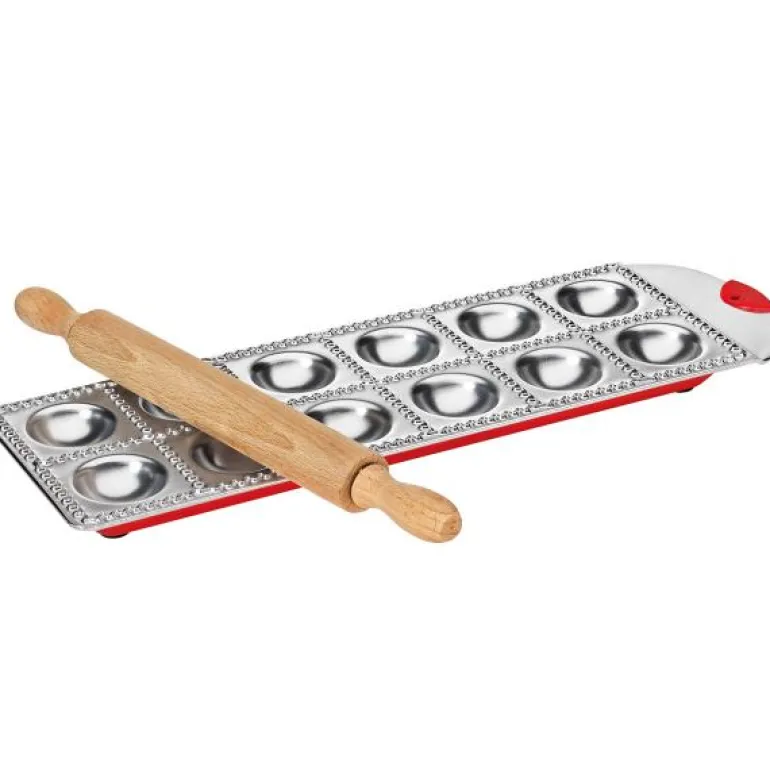 Raviolibrettet er perfekt for å lage deilige pastaer med fyll. Raviolibrettet er enkelt å bruke og kan lage 12 ravioli om gangen. Bare legg en deigremse som er litt større enn platen, trykk deigen inn i de 12 formene og fyll ravioliene dine. Pensle så kantene på pastaen med litt eggeplomme, legg et nytt deigstykke over og rull med medfølgende rull over formen slik at ravioliene lukker seg. Raviolibrettet er laget av aluminium og har sklisikre gummiføtter.