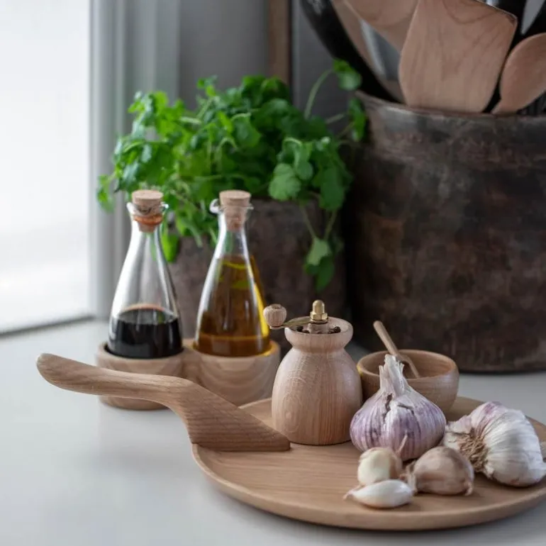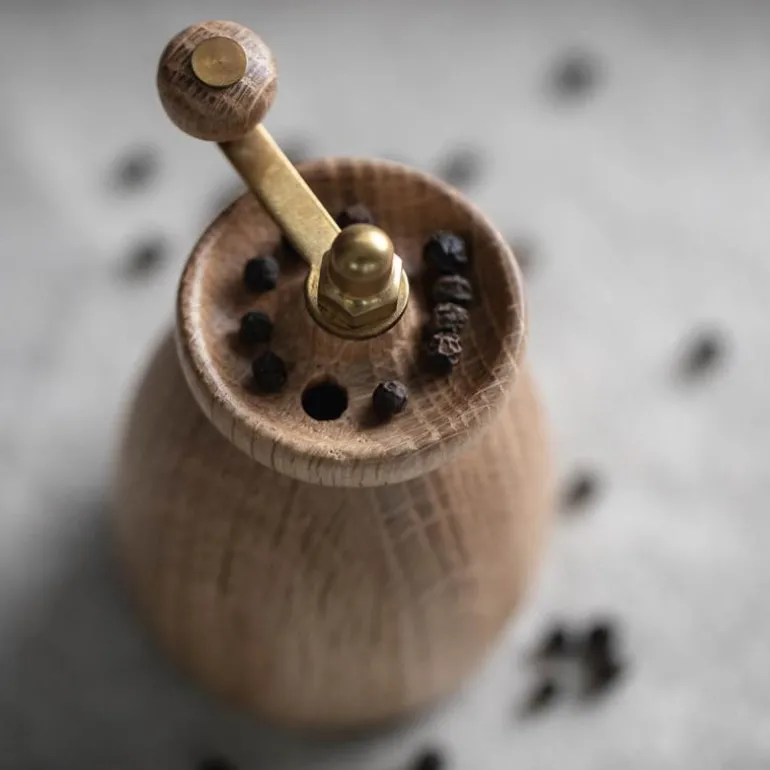 Organisk lekker pepperkvern fra Kay Bojesens Menageri-serie. Kvernen måler 9,3 cm i høyden og er dreid av sammensatte stykker av eik, slik at vi kan se treets fine årer, og kvernen er utrolig myk og deilig å holde i. Pepperkvernen er utstyrt med en keramisk Crush Grind-kvern som kan innstilles til ulik finhetsgrad, og den leveres med 25 års garanti.