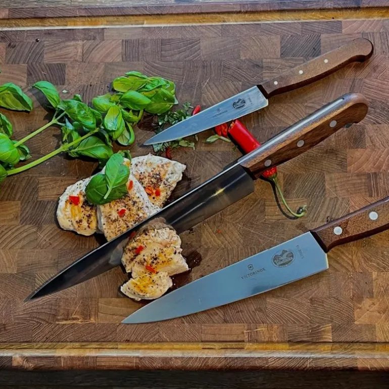 Victorinox knivsett i 3 deler i gaveeske er et allsidig sett som gjør at du enkelt skjærer opp ulike råvarer. Settet inneholder kokkekniver med bladlengde på 12 cm, 19 cm og 22 cm. Knivene har robust tre håndtak i elegant design som er polert for hånd for å gi et komfortabelt grep. Kjøkkenkniven på 12 cm er perfekt til å skjære opp små frukt og grønnsaker og den er den ideelle følgesvenn til kokkeknivene på 19 cm og 22 cm som begge skjærer jevne fine stykker av kokt og grillet kjøtt uten å ødelegge kjøttets fibre.