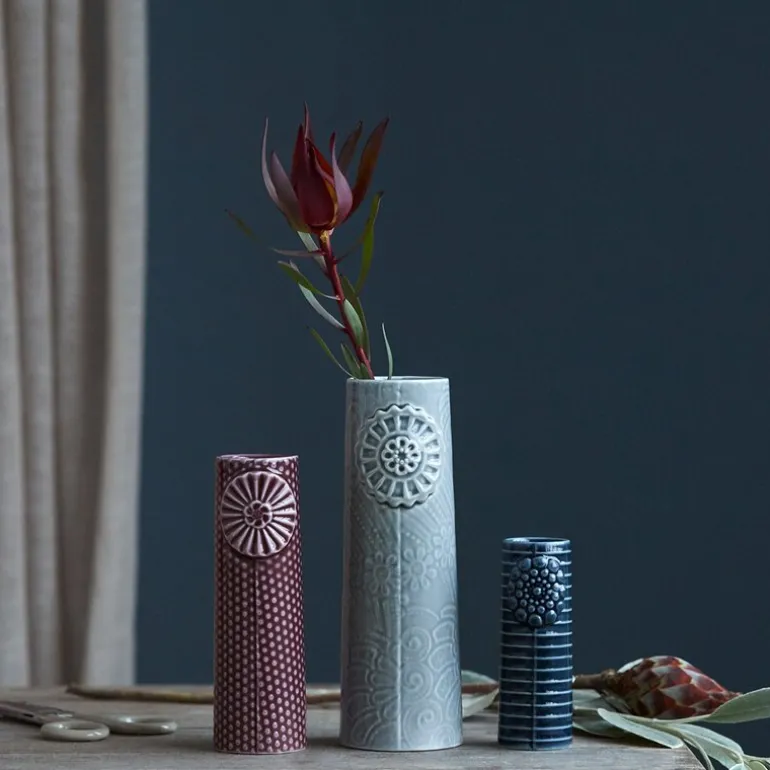 Pipanella Flower Small Vase i mørk farge fra Dottir er et sjarmerende stykke som tilfører både eleganse og lekenhet til ethvert rom. Designet av Thora Finnsdottir, er denne vasen inspirert av blomstermotiver som gir en følelse av glede og liv til innredningen. Den organiske formen og den dype, mørke glasuren gir en sofistikert kontrast, mens det blomsterpregede mønsteret tilfører en subtil touch av natur.