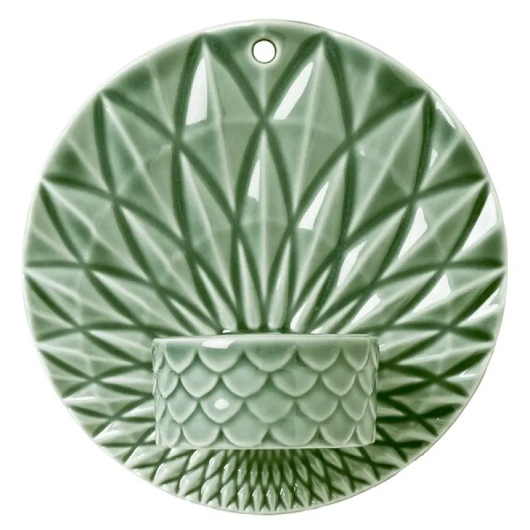 Pipanella vegglysestake Scales i grønn fra Dottir er en elegant og stemningsfull telysholder som tilfører hjemmet ditt varme og skjønnhet i de mørke timene. Designet av Charlotte Adrian, har denne veggmonterte lysestaken et detaljert skalamønster og en dyp grønn glasur som skaper et fortryllende lys- og skyggespill på veggen.