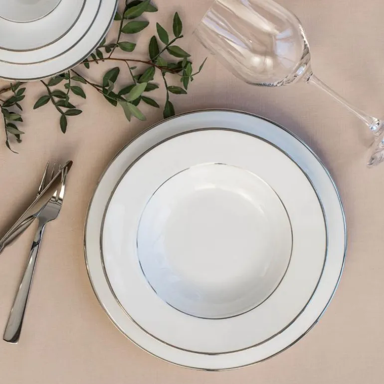 Tallerken i serviset Platinum fra Royal Porcelain. Festserviset Platinum er en tidløs serie. Serien har et rent og elegant design i hvitt benporselen kantet med sølv. Med Platinum føler du virkelig at du spiser av kongelig porselen. Gjør stas på gjestene dine ved å servere rykende varm kaffe fra den nydelige 1,2 liters porselenskannen. Platinum-serien kan fint kombineres med produkter fra Royal Porcelains andre serier, som Angelina Platinum eller Extreme Platinum.Serien er produsert av Royal Porcelain, en av Norges største merkevarer innen serviser. Platinum er laget av benporselen, som er den aller fineste type porselen. Serviset tåler oppvaskmaskin, men som med alle serviser med sølv eller gullkant bør serviset ikke vaskes med temperatur over 50 grader og det bør brukes halv dose med vaskemiddel.. Royal Porcelain Platinum får du kun hos Tilbords. Platinum-serien er et komplett festservise, som inneholder alt du trenger til de ekstra spesielle anledningene. Det enkle, tidløse designet gjør at serviset er like aktuell til alle årstider og kan kombineres med bordpynt i dine favorittfarger. Serien inneholder tallerkener i ulike størrelser – til forrett, hovedrett og dessert – serveringsfat i flere størrelser, suppeterrin, sausenebb og salatbolle. I tillegg finner du selvsagt et komplett kaffeservise. Platinum er et servise du kan samle hele livet, og er et naturlig valg å sette på bryllupslisten.