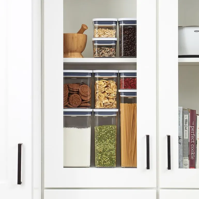 POP Containers fra OXO er lufttette oppbevaringsbokser til sukker, mel, pasta, ris og andre tørre matvarer. De har et elegant design, fås i mange størrelser og kan stables, så de utnytter plassen og passer i alle kjøkkenskapene. Lokket har en unik trykkfunksjon som sørger for at det lukker helt tett, samtidig som det fungerer som et håndtak, når det åpnes. Den lufttette forseglingen holder maten frisk lenger, og boksenes rundede hjørner gjør det lett å helde ingrediensene ut av dem. På undersidne av lokket kan man feste forskjellige tilbehør, som kjøpes separat. Lokket kan demonteres for grundig rengjøring, og både selve POP Containeren og lokket tåler oppvaskmaskin. POP Containers kan også brukes i garasjen, på hobbyrommet, barnerommet, osv.