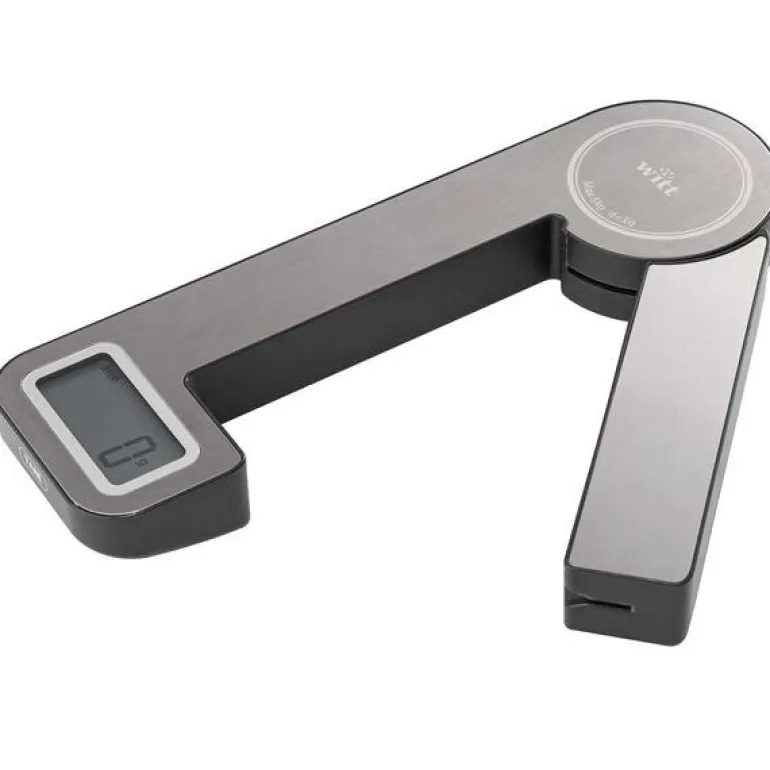 Praktisk sammenleggbar vekt, Premium fra Witt. Vekten lades enkelt ved å åpne og lukke vekten raskt et par ganger – den har ikke behov for batteri. Testet opptil 50 000 ganger. Kapasitet: 5 kg/1 g, Enheter: g, oz, vann-ml, melk-ml, Tare-funksjon / Automatisk slukking, Indikatorer for lav energi / overvekt. Tar ikke opp mye plass i kjøkkenskuffen.