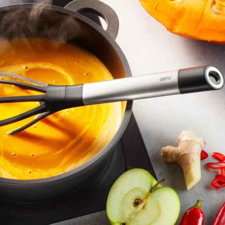 Den uunnværlige allrounderen for uanstrengt vispning av kremete sauser, forsiktig bretting av skummende eggehviter, luftig, jevn kakeblanding, perfekt bundne sauser og mye mer. Holder formen og er ideell for bruk med belagte gryter og panner. – formstabil og fleksibel – ideell for belagte gryter og panner – varmebestandig opptil 210°C – ergonomisk håndtak Ø 6,8 cm, L 29,5 cm, B 6,8 cm, H 6,8 cm Høyverdig rustfritt stål / plast.Tåler vask i oppvaskmaskin.