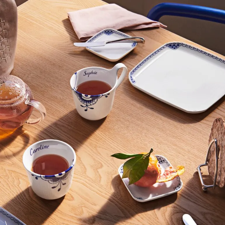 Prinsesse firkantet tallerken 21 cm fra Royal Copenhagen. Med vakre håndmalte dekorasjoner på blondekanten og en ellers blank riflet overflate, fungerer Prinsesse firkantede fat som en vakker borddekking for servering av velsmakende snacks eller nybakte småkaker.