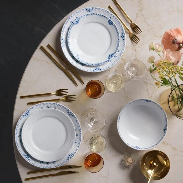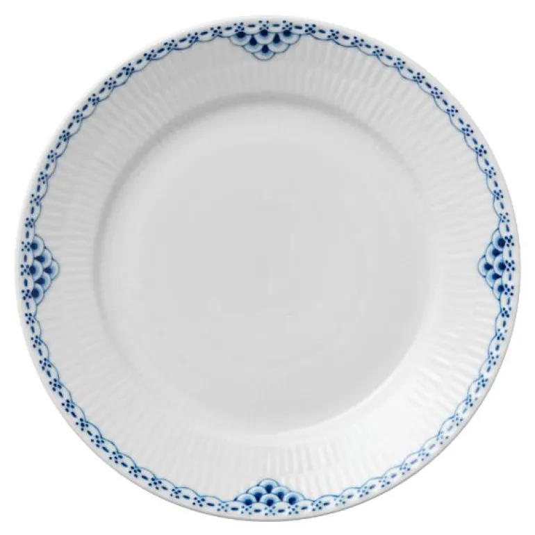 Prinsesse tallerken 22 cm. Prinsesse-serien er romantisk med et lett uttrykk. Opprinnelig ble det designet som et teservise, men i 1978 ble mønsteret produsert som et fullt middagsservise. Den håndmalte, elegante blondekanten kan minne om mønsteret i Musselmalt-serviset.