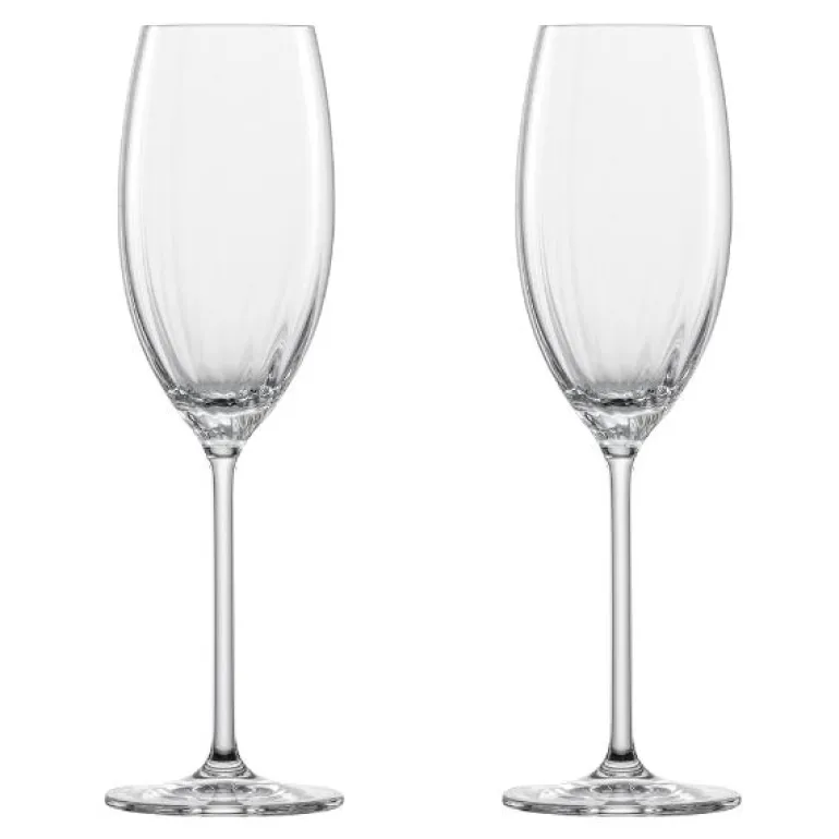 Eske med 2 stk champagneglass 28 cl, i serien Prizma fra Zwiesel.Zwiesel glass verdsettes av både vinkjennere, sommelierer og Michelinstjerne-restauranter verden over.Prizma er designet for å tilby det høyeste nivået av sensorisk nytelse ved å gi vin tilstrekkelig plass til å utvikle sin fulle aroma.Prizma champagneglass vil garantert skape en brusende opplevelse.Zwiesel er en tysk kvalitetsprodusent av glass. Med stolte tradisjoner siden 1872 er Zwiesel ikke først og fremt en industribedrift, men snarere som et håndverk fra den eksklusive glasskulturen. Bedriften har erfaringer som strekker seg på tvers av generasjonerHistorien til Zwiesel strekker seg tilbake til 1872 da Anton Muller startet et lite glassverk som nå har utviklet seg til å bli en av de internasjonalt ledende produsentene av glass. Med fokus på kvalitet i hvert produkt er ikke Zwiesel først og fremst en industribedrift, men et ekte håndverk som blir overlevert fra generasjon til generasjon. Tradisjon og innovasjon smeltes sammen til glasskunst i hvert eneste glass. Glassene er ment for å skape glede og fellesskap, og når en skåler med et Zwiesel-glass høres den umiskjennelige lyden av ekte gjestfrihet. Alle Zwiesel-glass tåler oppvaskmaskin, og bør kjøres på et glassprogram på maks 55 °C. Sett glassene stødig slik de ikke faller, og unngå at glassene kommer i kontakt med hverandre eller andre gjenstander i maskinen. Vaser og karafler bør vaskes for hånd. Bruk vaskemiddel som er anbefalt for glass.