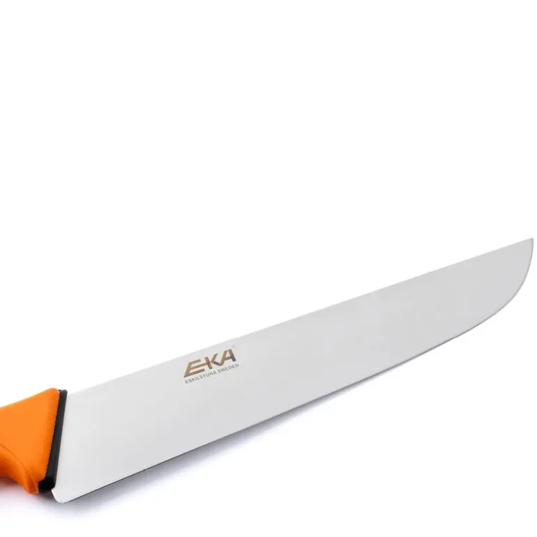 EKA Butcher Pro slaktekniv i oransje, med ekstra bredt blad og bladlengde på 26 cm, er en robust og allsidig slakterkniv designet for å møte behovene til både profesjonelle kokker, jegere og hjemmekokker. Med sitt ekstra brede blad og spisse topp er kniven ideell for presise snitt, kraftig hakking og effektiv kutting av både kjøtt og grønnsaker.