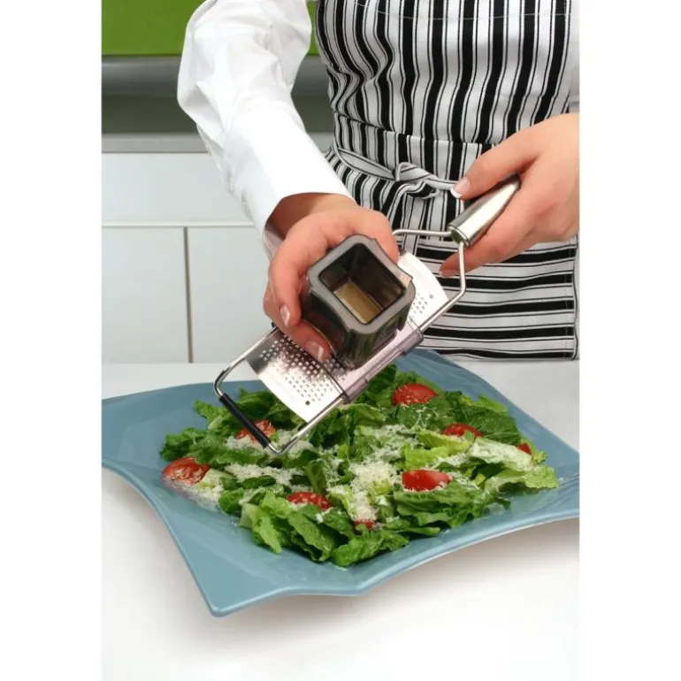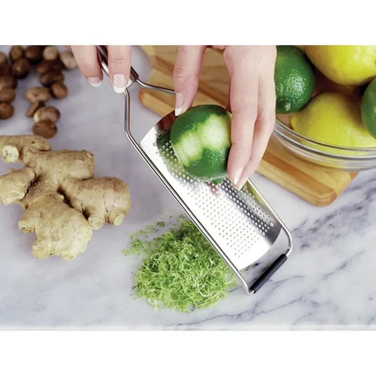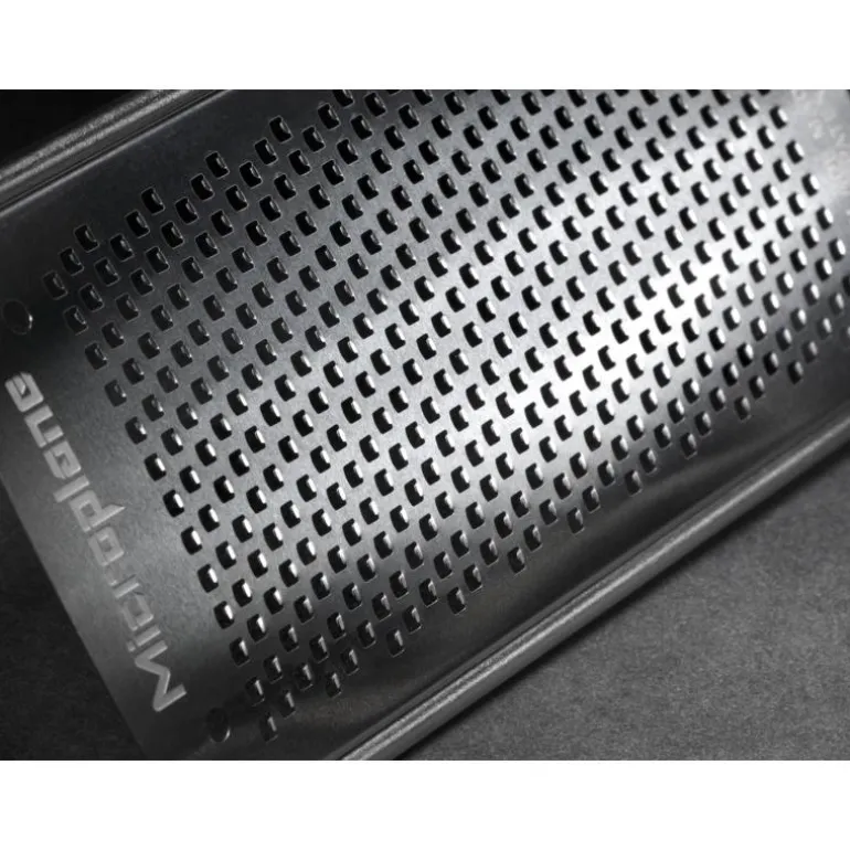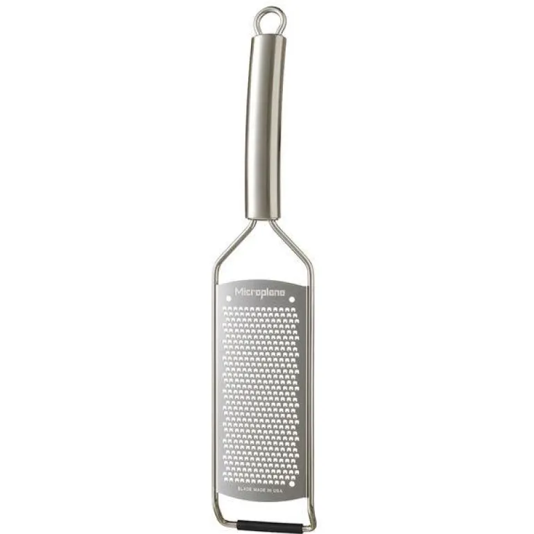 Et rivjern til fint bruk fra Microplanes Professional-serie. Det er utstyrt med et sylskarpt skjær, som er laget av fotoetset stål. Det betyr, at råvarene blir skårne i stedet for flått, som på mange andre rivjern. Dertil gjør det også, at det blir bevaret mere smak og aroma i dine matvarer. Takket være den høye kvaliteten og ingen sløve blader, blir Professional-serien valgt til av mange profesjonelle kokker fremfor så mange andre. Den sklisikre foten og det ergonomiske håndtaket gjør rivjernet lett å arbeide med og større sikkerhet ved bruk. Det klassiske designet på rivjernet matcher alle kjøkken. Skjæret på Microplane er så skarpt, at det kan rive i tre. Det fine Professional rivjernet er perfekt til sitrusskall, parmesan, ingefær og muskat.