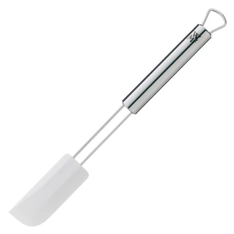 For mesterbakere og de med en søt tann: Deigskraperne fra WMF Profi Plus-serien skraper lett ut deig og andre tykke blandinger og etterlater praktisk talt ingenting i blandeskålene, grytene og pannene. Den spesielle formen på deigskraperens silikontupp gjør at du kan nå inn i alle hjørner og kurver. Bruk den harde siden på skraperen for å fordele og smøre krem, smeltet sjokolade, hjemmelaget syltetøy eller glasur på kaker og kakebunner. Håndtaket er laget av Cromargan® rustfritt stål, og deigskraperen kan lett henges opp etter løkken i enden av skaftet.