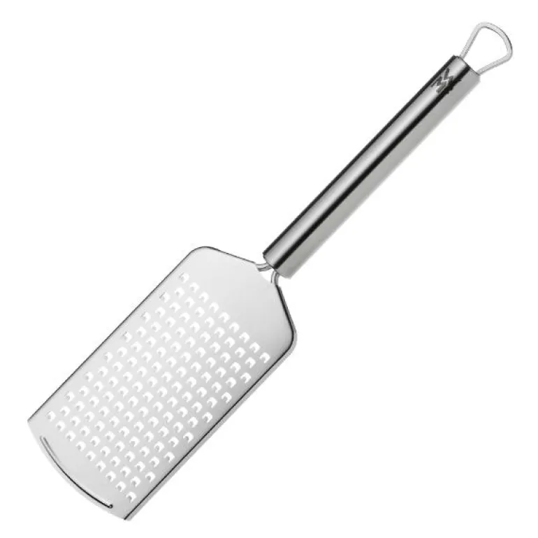 Jobb sikkert med skarpe blader: rivjernene fra WMF Top Tools-serien lar deg rive harde grønnsaker som gulrøtter eller sjokolade eller muskat i små biter eller flak. Fingerbeskytteren og det sklisikre håndtaket lar deg jobbe effektivt og sikkert. Muskat eller hvitløksbåter kan legges i den gjennomsiktige holderen for å beskytte fingrene dine. WMF rivjern fra Top Tools-serien fås i to utgaver: medium og fin. Begge modellene kan vaskes i oppvaskmaskin.