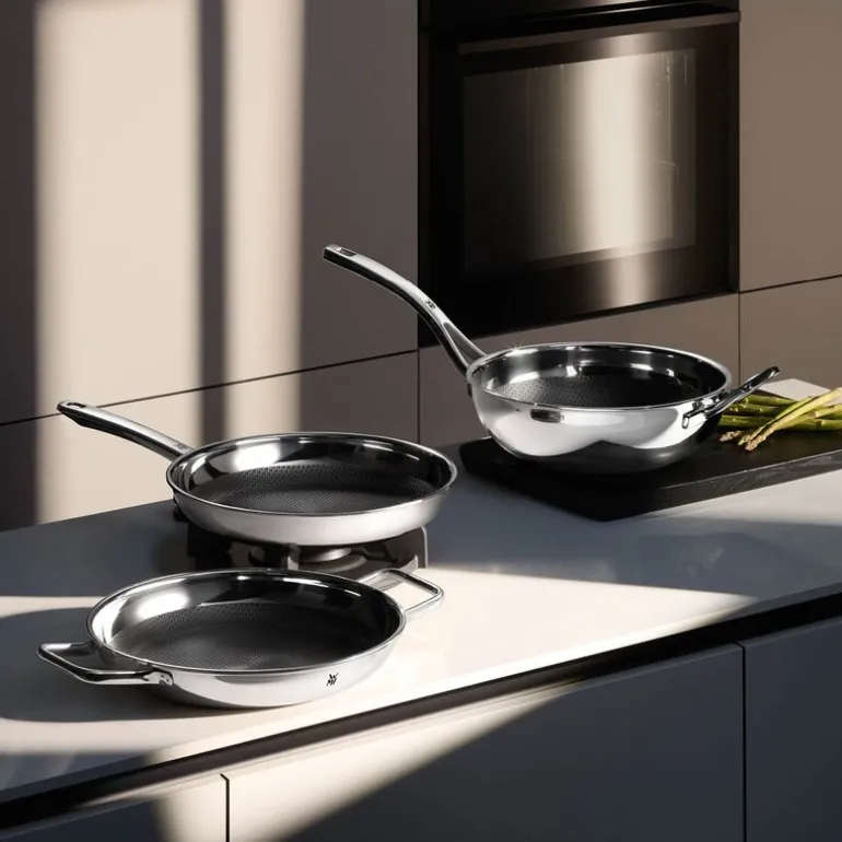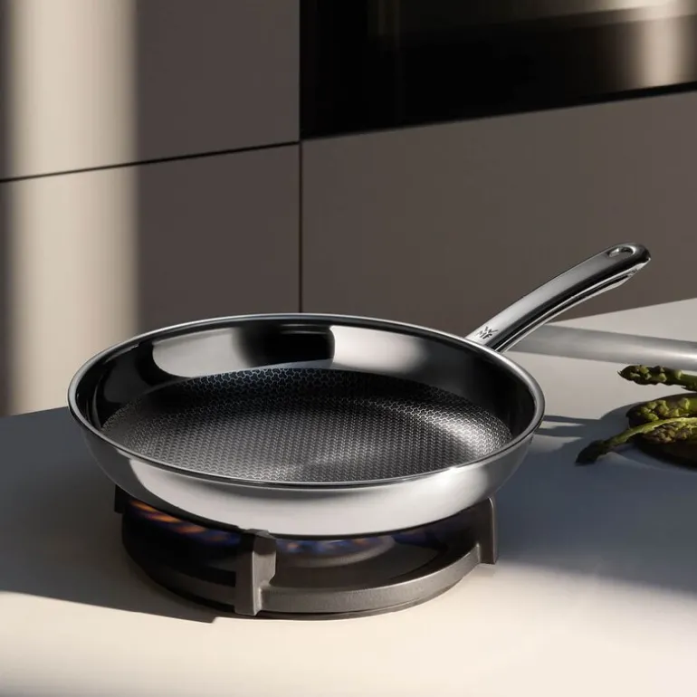 Den unike honeycomb-strukturen i WMF Protection Grid beskytter det slitesterke PermaDur non-stick belegget, slik at du kan bruke metallredskaper uten å bekymre deg for riper. Pannen har en aluminiumskjerne omsluttet av Cromargan® rustfritt stål for rask og jevn varmefordeling.