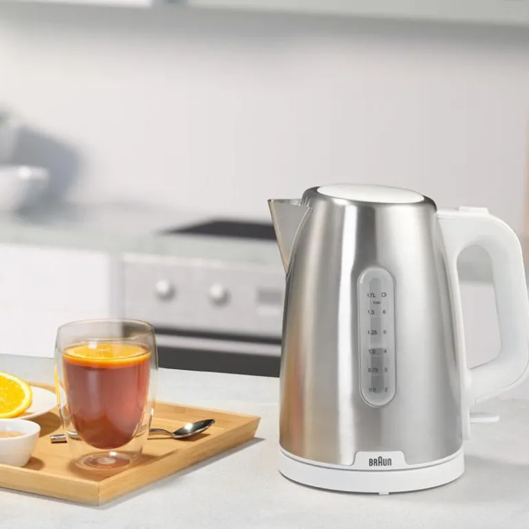 Purshine vannkoker 1,7L WK1500.WH hvit fra Braun. Pift opp morgenen din med den helt nye PurShine Breakfast-kolleksjonen. Dette brukervennlige og stilsikre utvalget vil glede deg og gjøre morgenrutinene dine raske og deilige. Vår rustfrie stål vannkoker på 1,7 liter med Rapid Boil-systemet er ideell for å få en rask kopp perfekt te. Den koker 200 ml vann på bare 45 sekunder! Kolleksjonen er tilgjengelig i både svart og hvitt, og har Brauns ikoniske design med detaljer i børstet metall som lyser opp ethvert kjøkken.