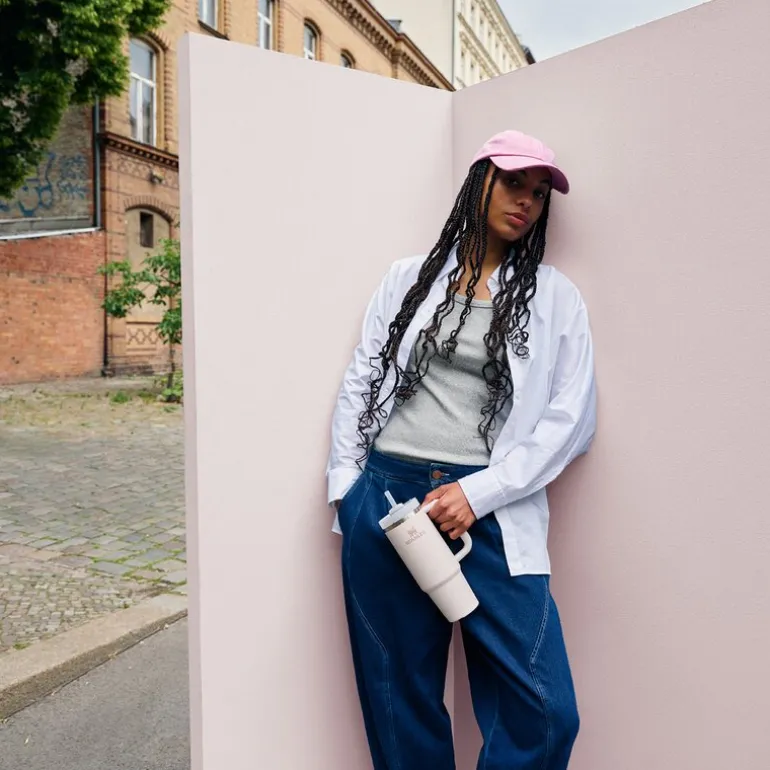 Stanley Quencher 0,88L i fargen Rose Quartz kombinerer kapasitet og funksjonalitet i en elegant form. Den smale bunnen passer i koppholdere, og det komfortable håndtaket gjør flasken enkel å bære med seg – enten du er på vei til møter, trening eller helgetur.