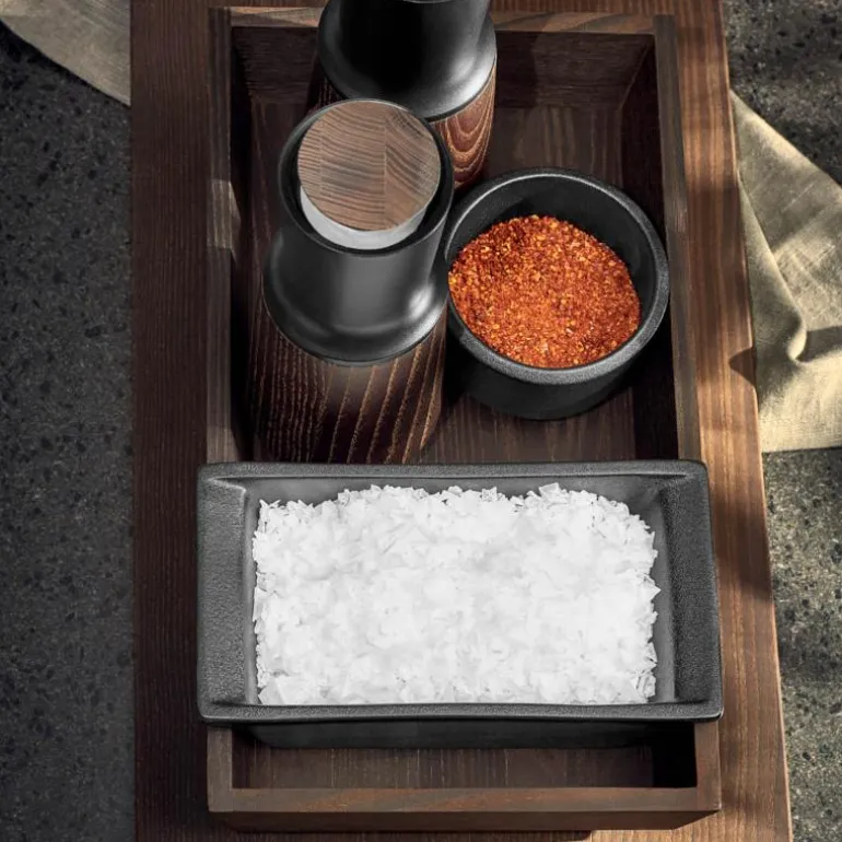 Kjøkkenserien RÅ fokuserer på godt håndverk og brukervennlig nordisk design. Godt grep er kjernen i serien, som er laget i varmebehandlet og gjennomfarget ask. Bordsaltkaret er laget i keramikk med lokk i ask, og underdelen har en rustikk overflate i jern og kan vaskes i oppvaskmaskin. I RÅ-serien finnes i tillegg krydderbakke, stort saltkar, kvern og skjærebrett. Flott gavetips for de som setter pris på nordisk design og gode redskaper på kjøkkenet.
