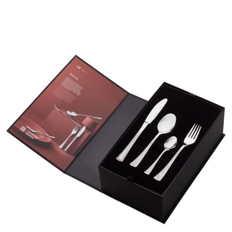 Settet, som kommer i en elegant gaveeske, inneholder alt nødvendig bestikk til tolv personer: tolv spisekniver (21 cm), spisegafler (18,2 cm), spiseskjeer (17,9 cm) og teskjeer (12,75 cm). Ramona-designet, som ble introdusert i 1982, utmerker seg ved sin harmoniske kontrast mellom matte og blanke overflater og de stilrene, geometriske formene. Det rette designet kan bidra til en bedre smaksopplevelse og gir borddekkingen en ekstra finesse.
