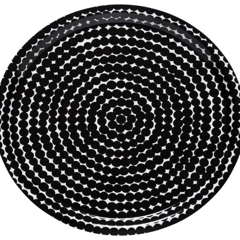Laget av laminert bjørkekryssfiner, bærer dette runde brettet det klassiske Räsymatto-mønsteret i svart og hvitt. Brettet måler 31 cm i diameter. Räsymatto-mønsteret (filleteppe), inspirert av kolonihagearbeid, er knyttet til aktuelle temaer som bærekraftig livsstil og gleden ved å jobbe med hendene. Parseller, med sine blomster- og grønnsaksbed, representerer urban natur på sitt beste, og et filleteppe på gulvet i en kolonihytte forteller en fargerik historie for seg.
