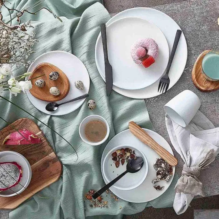 De mange variasjonene i farge og tekstur gjør hvert stykke unikt og gir varene et håndlaget utseende. En eksklusiv rå gjennomfarget steintøyleire som er dobbeltfyrt for å oppnå høyeste kvalitet og lang holdbarhet – RAW Arctic White steintøy er laget for daglig bruk i det nordiske hjemmet.