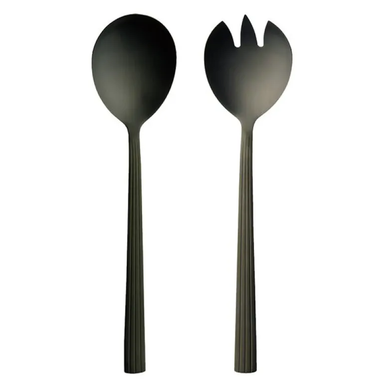 Aida, RAW salatsett 2 deler matte black fra Aida er en del av den elegante Aida Raw-serien, som kombinerer rå teksturer med naturlige farger og materialer for å skape en unik og enkel design med en nordisk følelse. Salatbestikket er laget av rustfritt stål og er tilgjengelig i fargene champagne, mattstål og mattsvart, noe som gir et tidløst og sofistikert innslag til serveringen din.