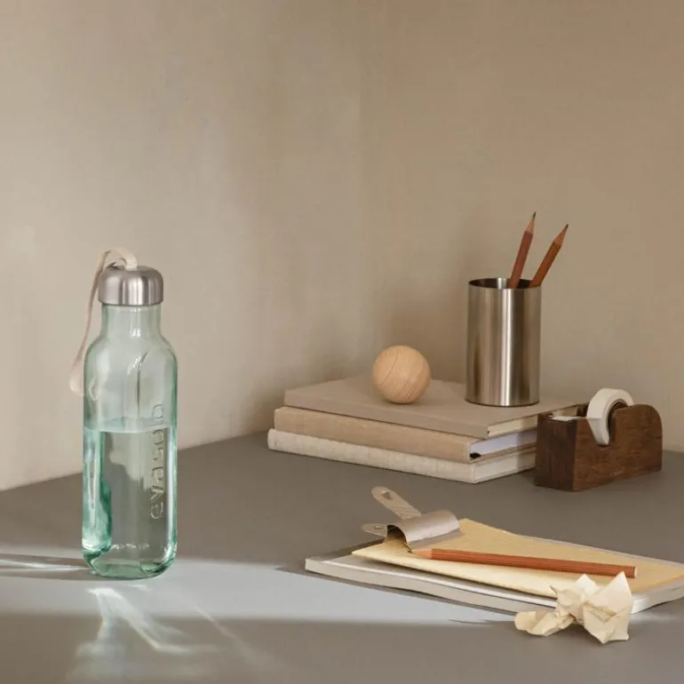 Recycled er et godt alternativ til deg som ikke ønsker å drikke fra plast- eller metallflasker. Det resirkulerte glasset er et unikt materiale som gir hver drikkeflaske et eget uttrykk, og den praktiske bærestroppen gjør flasken enkel å ta med seg. Lokket er helt tettsittende, så du kan bære med deg flasken i veska.