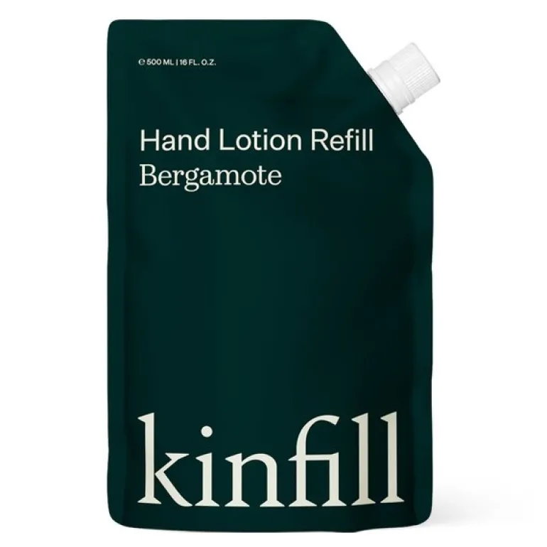 Refill håndkrem 500 ml bergamote fra Kinfill. En påfyllbar håndkrem, fylt med plantebaserte ekstrakter av chia, ginseng og sheasmør (karité), denne silkeaktige formelen fukter, beskytter og pleier hendene dine. Fri for mineraloljer og silikoner.