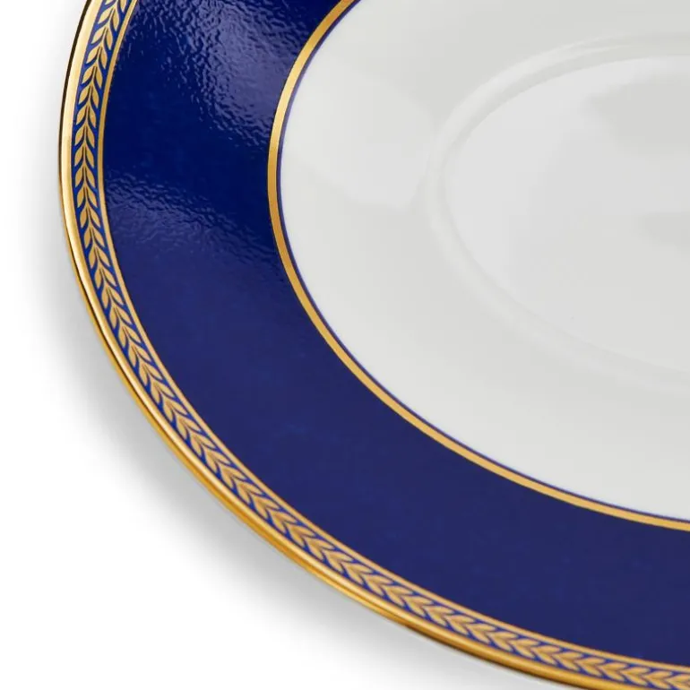 Renaiss Gold Sauce Boat Stand. Med inspirasjon fra Wedgwoods betydelige arkiv er Renaissance Gold gjennomsyret av autentisitet, samtidig som den opprettholder en moderne, klassisk stil. Ved å kombinere elegante interiørdesignmotiver med den rene, ovale formen til den berømte Wedgwood Cameo, sammen med marineblått, 22 karat gull og dristige florentinske aksenter fanges dette i et slående, elegant mønster. Perfekt til formelle middager, men kan også brukes som et storslått alternativ til hverdags. Ekspressive mønstre er flotte i kombinasjon med vanlig hvitt, slik at man kan skape sitt eget uttrykk i borddekkingen.