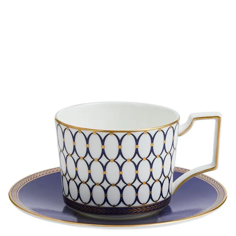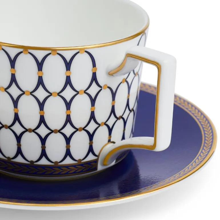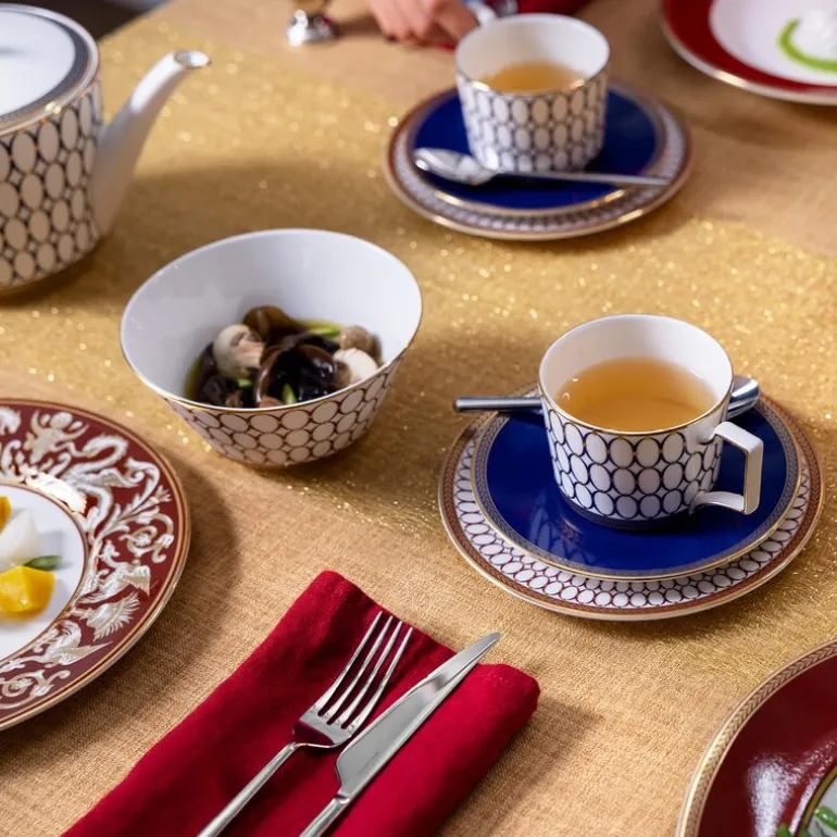 RENAISSANCE GOLD TEAC&S. Med inspirasjon fra Wedgwoods betydelige arkiv er Renaissance Gold gjennomsyret av autentisitet, samtidig som den opprettholder en moderne, klassisk stil. Ved å kombinere elegante interiørdesignmotiver med den rene, ovale formen til den berømte Wedgwood Cameo, sammen med marineblått, 22 karat gull og dristige florentinske aksenter fanges dette i et slående, elegant mønster. Perfekt til formelle middager, men kan også brukes som et storslått alternativ til hverdags. Ekspressive mønstre er flotte i kombinasjon med vanlig hvitt, slik at man kan skape sitt eget uttrykk i borddekkingen.