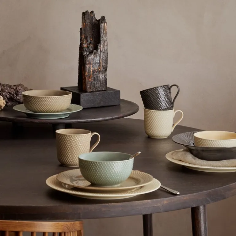 Alle de fire vakre fargene i Rhombe Earth-serien – clay, marble, moss og slate – er, akkurat som i Lyngby Porcelæns populære Rhombe Color-serie, nøye utvalgt av designduoen Stilleben, som består av Ditte Reckweg og Jelena Schou Nordentoft. Bruk alle de forskjellige Rhombe Earth-delene sammen i borddekkingen, og la tallerkenene i ulike størrelser titte frem under hverandre, slik at de varme fargene får lov til å snakke sammen. Tallerkenene, krusene og skålene i Rhombe Earth er selvfølgelig også både sammen og hver for seg naturlige supplement til din Rhombe Color-samling eller i kombinasjon med det klassiske hvite Rhombe-serviset, der de grå og brune nyansene på de enkelte Rhombe Earth-delene sammen med Lyngby Porcelæns linjer til perfeksjon vil skape et både moderne og avslappet uttrykk og stå vakkert mot det hvite porselenet.