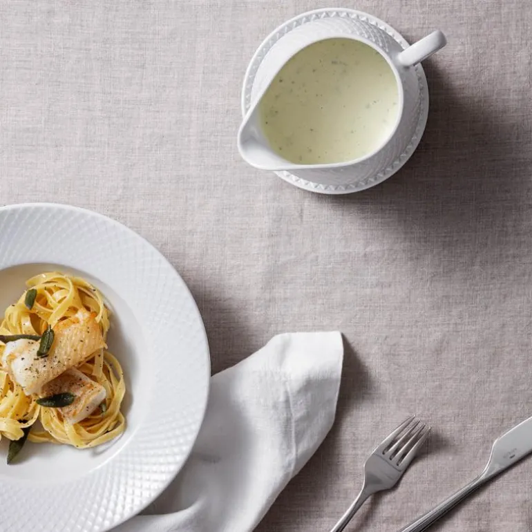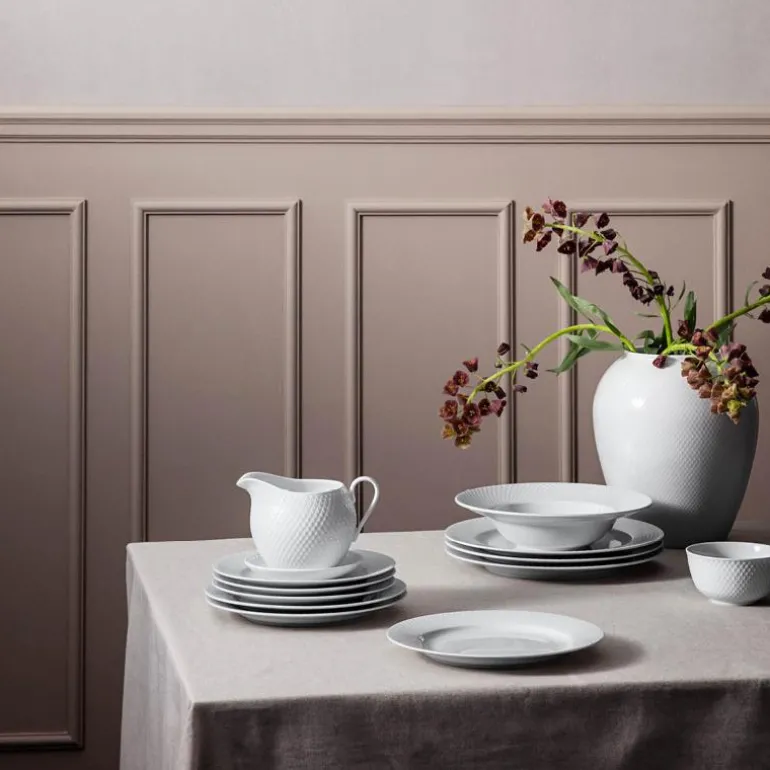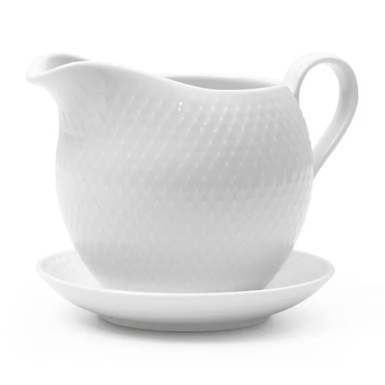 Den fineste sausekannen med tallerken finner du hos Lyngby. Denne sausekannen er designet med tydelig referanse til Rhombe-serien. Med flere elementer i denne serien vil du kunne dekke det vakreste bordet. Dessuten har sausekannen en sammenheng med Lyngby-serien Fredensborg. Dette er en del av designarkivet for Lyngby Porcelæn. Sausekannen er fremstilt i blankglasert porselen. Det er særlig dette materialet som gjør kannen så stilren og vakker. Sausekannen har en tydelig karakteristisk buet form. Denne formen er med på å holde på varmen. Dessuten sender den referanser til formen på skåler og telyslykter. Den fine sausekannen er anvendelig på grunn av den klassiske tuten som gjør den enkel å helle av.