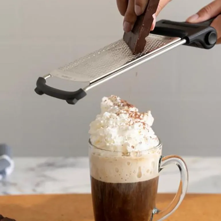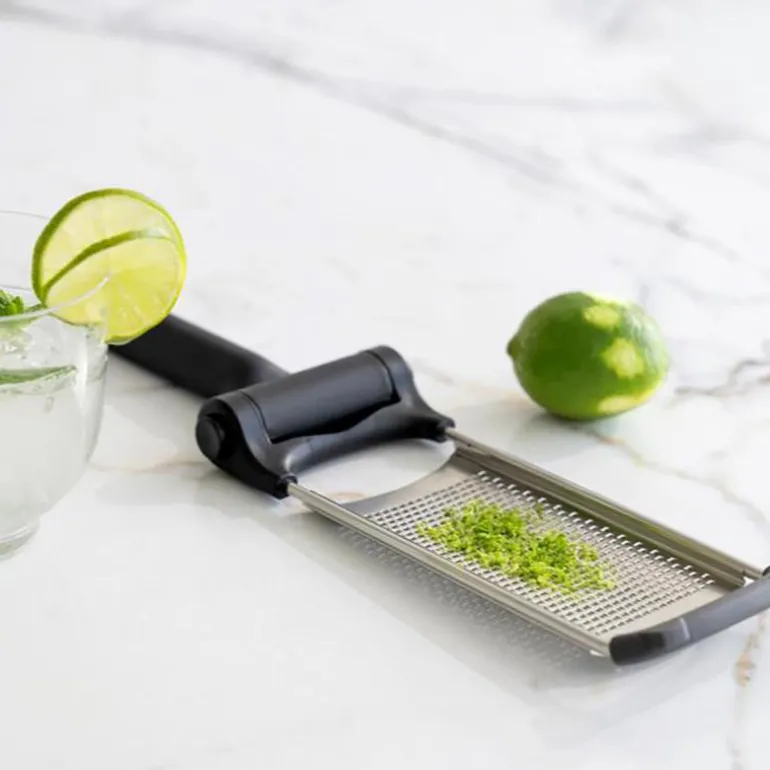 Det sammenleggbare zest/rivjernet har sklisikre ender med integrerte føtter, noe som gir stabilitet på ulike overflater. Enten du rasper direkte på en benkeplate eller over en skål, kan du regne med stabilitet hver gang.