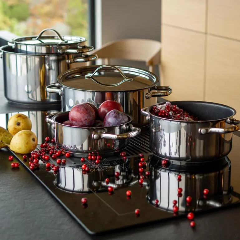 Rix gryte og panne serie er produsert i kvalitetstål 18/8 med blankpolert overflate og keramisk slipp-lett belegg. 5,3 mm induksjonsbunn, 0,8 mm vegg og 3 lag med keramiskslipp-lett belegg, som gjør at mat ikke fester seg seg så lett i bunnen. Bunnen har aluminiumskjerne på 4mm som er
