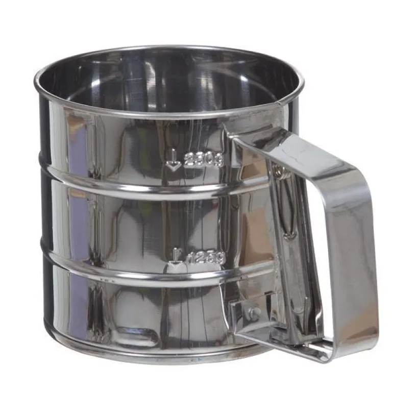 Denne melsikten har en genial funksjon som gir mindre søl. Håndtaket fungerer som en pumpe, som beveger risten i bunnen og sikter melis og mel jevnt. Produsert i 18/0 stål og rengjøres i oppvaskmaskin.