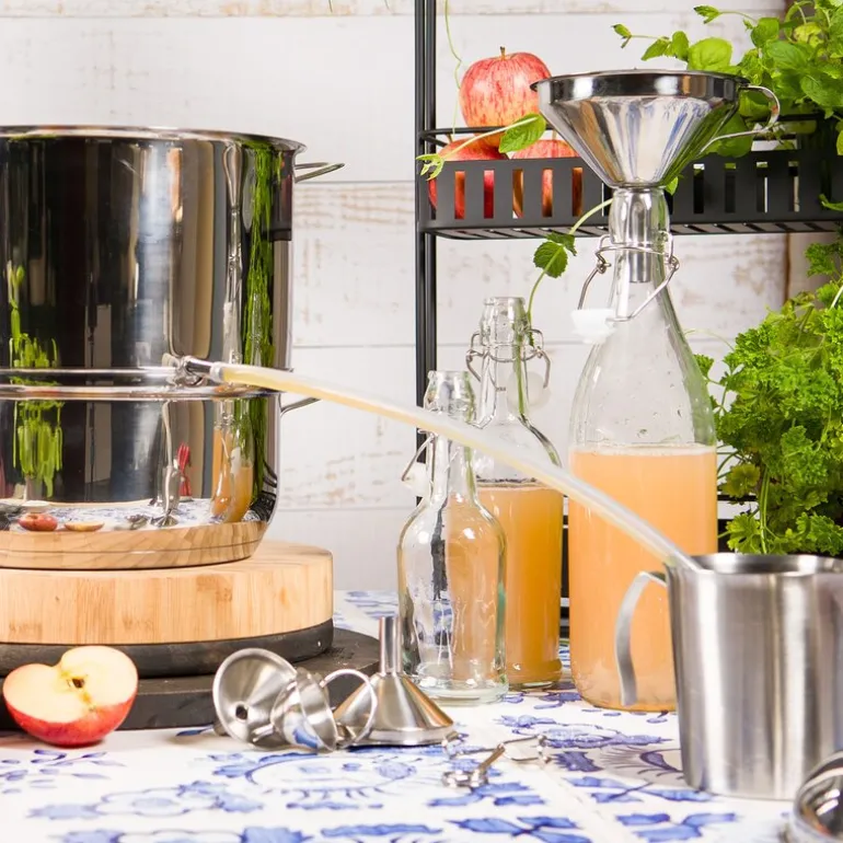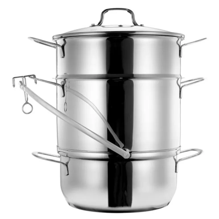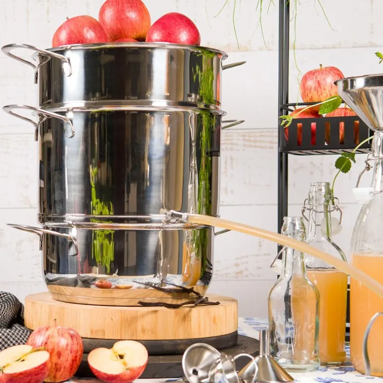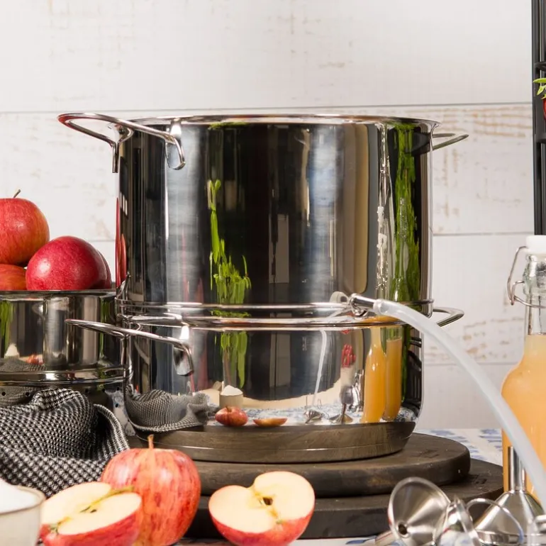 Saftkoker på 8 liter fra Modern House, produsert i rustfritt stål som kan brukes på alle plate- og induksjonstopper. Innsiden er matt polert og utsiden er blankpolert. Lag din egen saft eller syltetøy av sesongens friske bær og frukter!