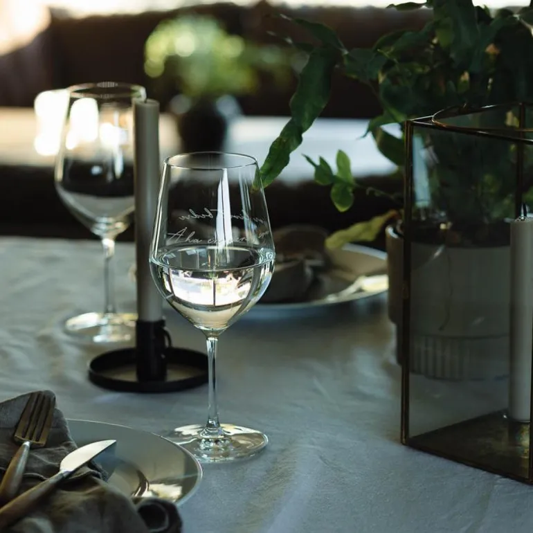 Rødvinsglass med lekker utforming. Glassene er utformet slik at en både kan nyte rødt og hvitt, men også lekre å servere en frisk juice.