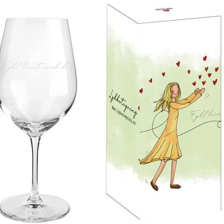 Rødvinsglass med lekker utforming og gravering. Fyll livet med det som godt er. Glassene er utformet slik at en både kan nyte rødt og hvitt, men også lekre å servere en frisk juice.