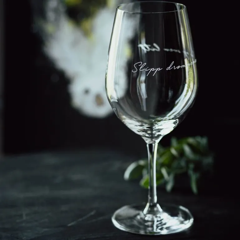 Rødvinsglass med lekker utforming og gravering. Slipp drømmene fri og svev litt. Glassene er utformet slik at en både kan nyte rødt og hvitt, men også lekre å servere en frisk juice.